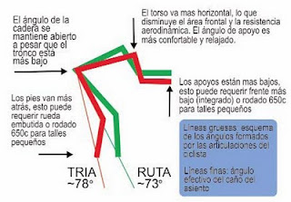 El principal cambio en la geometría de la bicicleta de triathlon frente a la de ruta es el aumento del ángulo del caño del asiento desde los 73/74 grados típicos de las bicicletas de ruta a los 76/78 grados de las bicicletas de triatlón.