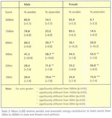 El siguiente gráfico resume los resultados de uno de estos estudios realizados en 2005 (Energy system contribution in track running).
