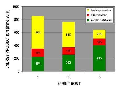 Aquí se puede observar que si bien en el primer sprint la producción aeróbica de energía cubre solo el 26% del total (74% aportado por las vías metabólicas anaeróbicas), consistente con los resultados mostrados anteriormente, cuando estos sprints se repiten mediando una recuperación de 4 minutos, la contribución de la producción aeróbica de energía crece rápidamente y en el tercer sprint ya cubre la mayor parte de los requerimientos energéticos (63%).