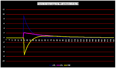 Puede verse que CTL y ATL evolucionan exponencialmente con el transcurso del tiempo, de forma similar a las componentes de adaptación y fatiga del modelo impulso respuesta dado que las constantes de tiempo son las mismas, el TSB es negativo inicialmente y crece exponencialmente hasta un máximo a partir del cual decrece a cero a largo plazo.
