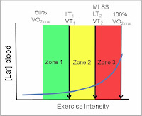 Podemos analizar la respuesta de la concentración del lactato en sangre en tres "zonas" en función de la intensidad del ejercicio: